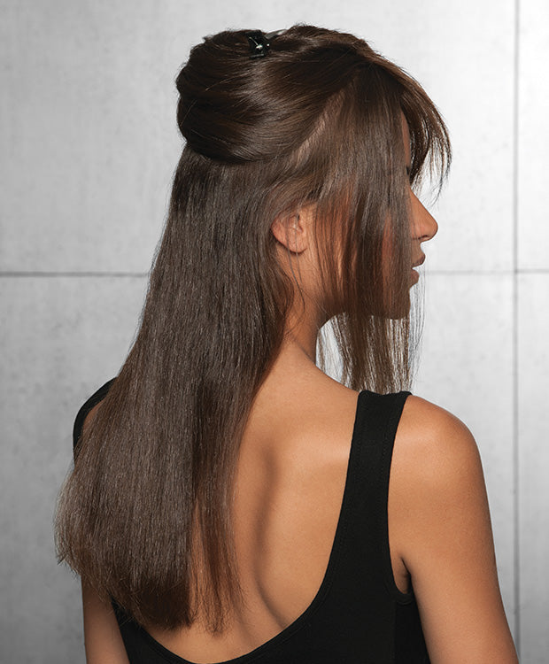 Your favorite halo-style hair extension upgraded to 100% human hair! Add 20 inches of length and beautiful volume in seconds. The discreet halo-style design makes it easy to wear this long, sexy look without clips. Simply place around the crown of your head and blend through with your own hair. The human hair lets you style sleek or curled and deposit any shade.